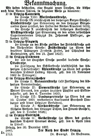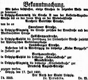 | 19:27, 8. Sep. 2024 | Bekanntmachung vom 17. Juli 1900.jpg (Datei) | 51 KB | André Loh-Kliesch | *Ausschnitt aus dem ''Leipziger Tageblatt'' vom 22. Juli 1900, Seite [6] *[https://digital.slub-dresden.de/werkansicht/dlf/359127/6# Digitalisat der SLUB Dresden] | 1 | |