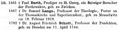 - 1667: Samuel Lange (1618–1667), Professor der Theologie, Pastor an der Thomaskirche, Superintendent