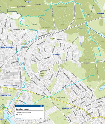 [[Bild:LeutzschGemarkung.jpg|thumb|350px|Leutzsch – die Grenze der Gemarkung ist türkis hervorgehoben]] | |||