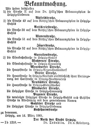 - Stadtarchiv Leipzig (Hrsg.): LEXIKON Leipziger Straßennamen. Leipzig: Verlag im Wissenschaftszentrum, 1995. Seite 18