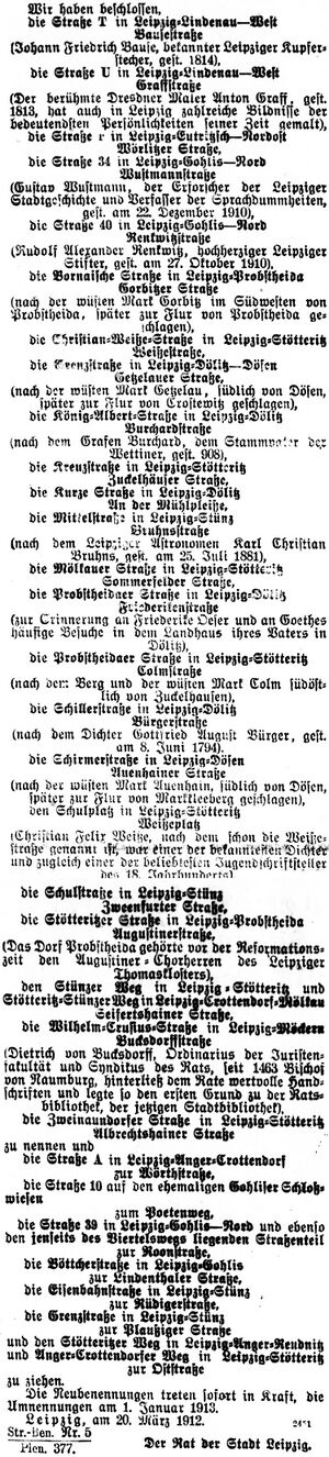 Im Leipziger Tageblatt vom 24. März 1912 wurde auf Seite 9 eine Bekanntmachung des Rats der Stadt Leipzig vom 20. März 1912 veröffentlicht, in der fünf neue Straßen erstmals einen Namen erhielten sowie zahlreiche Straßen mit einem Namen, der schon von einer anderen Straße belegt war, entweder einen ganz neuen Namen erhielten oder an benachbarte Straßen angeschlossen wurden.