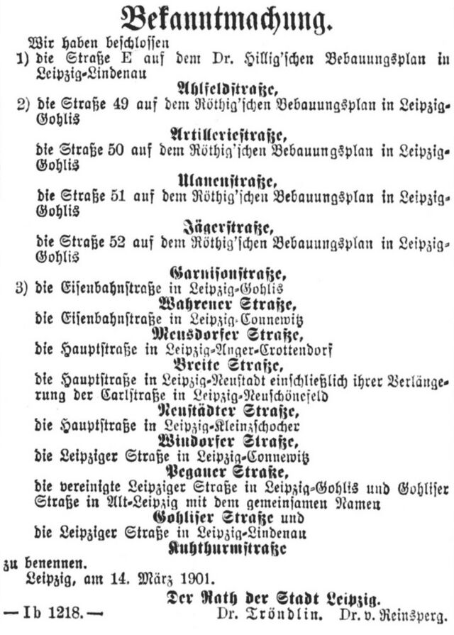 Im Leipziger Tageblatt vom 20. März 1901 wurde auf Seite [5] eine Bekanntmachung veröffentlicht, in der fünf neue Straßen ihre Namen erhielten sowie acht ältere Straßen in den eingemeindeten Vororten wegen Namensgleichheit umbenannt wurden.