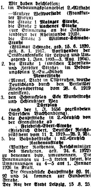 Im Leipziger Tageblatt vom 16. August 1925 wurde auf Seite 18 eine Bekanntmachung des Vortages veröffentlicht, in der fünf neue Straßen ihre Namen erhielten sowie zwei ältere Straßen im eingemeindeten Vorort Leutzsch wegen Namensgleichheit umbenannt wurden.